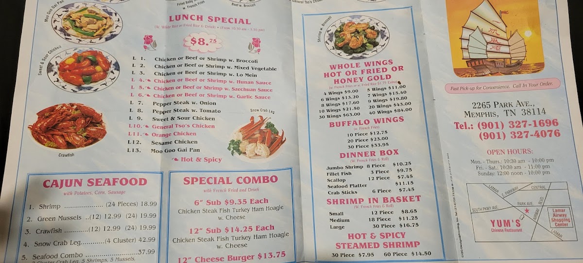 Welcome to Yum's Restaurant, a beloved culinary gem nestled in the heart of Memphis, Tennessee, at 2265 Park Ave. This unique dining establishment offers a cozy, albeit simplistic ambiance, drawing in locals and visitors alike who seek both comfort and flavor in their meal choices.